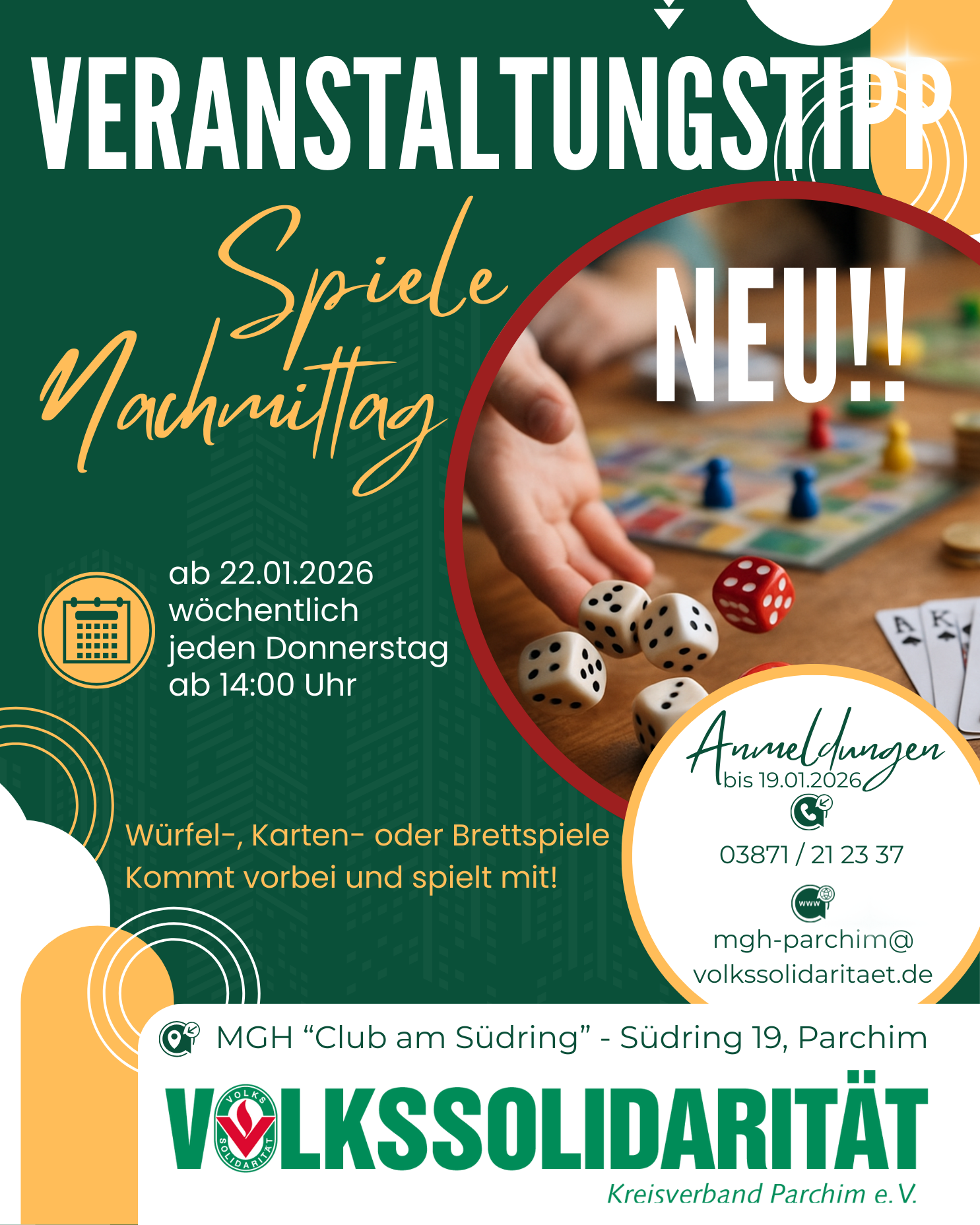 Los geht´s ab dem 17. Februar 2026 um 10:30 Uhr im Mehrgenerationen-haus "Club am Südring" in Parchim. Um besser planen zu können, bitten wir um Anmeldung bis zum 10.02.2026.