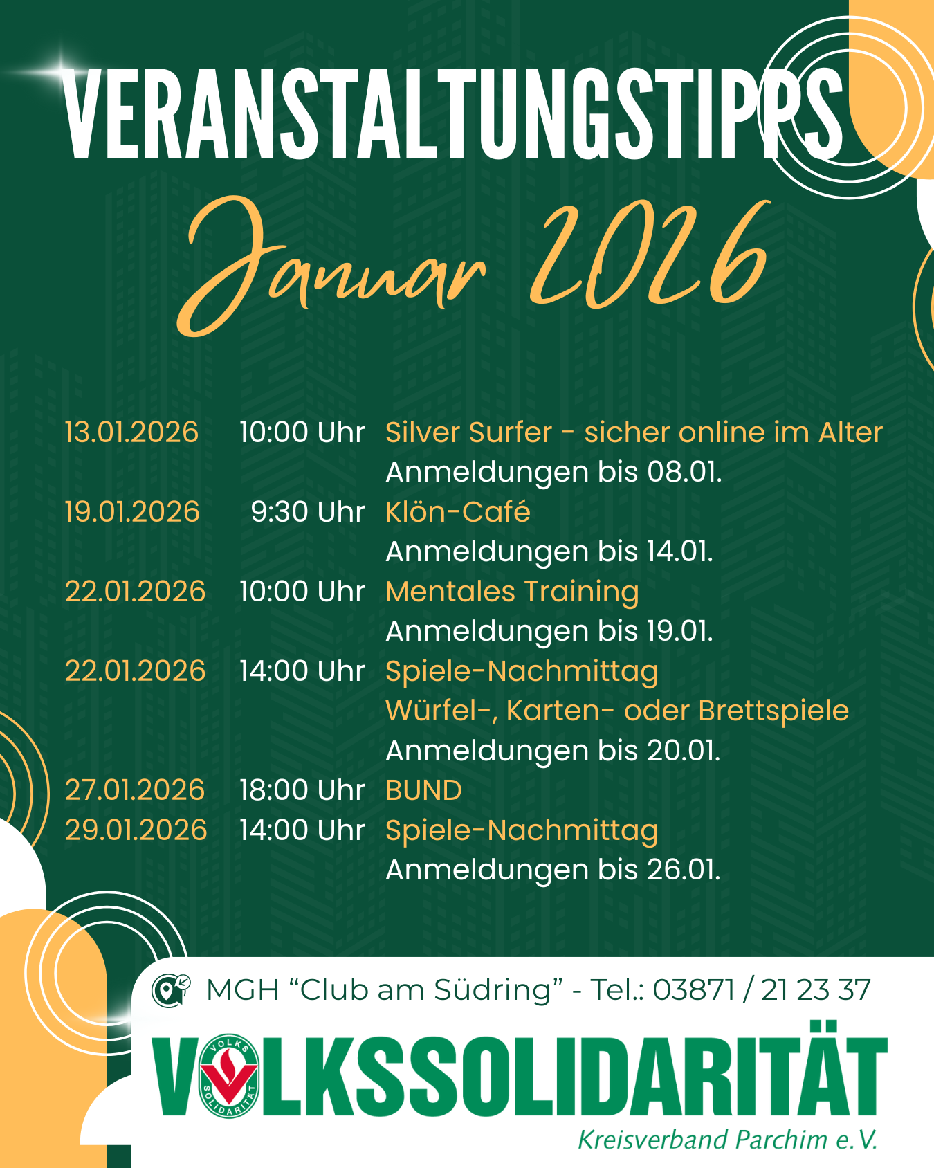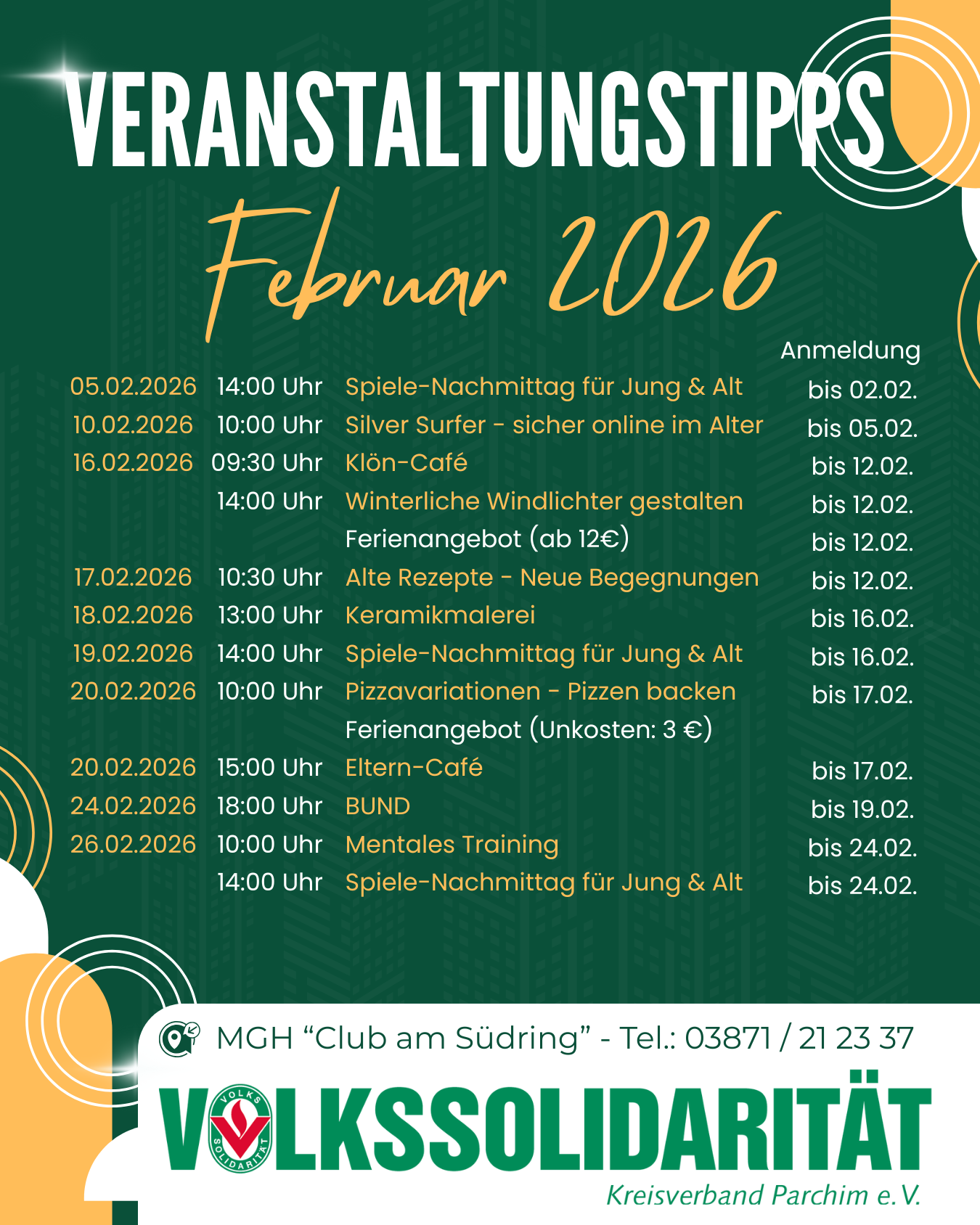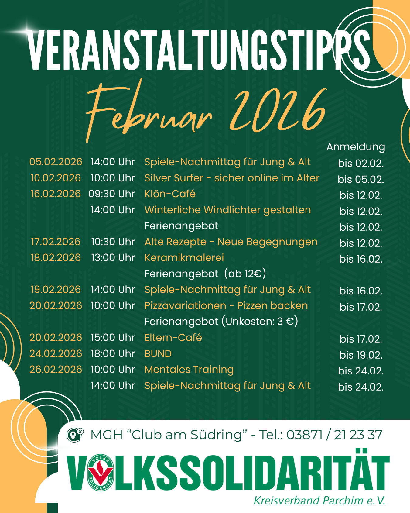 Los geht´s ab dem 17. Februar 2026 um 10:30 Uhr im Mehrgenerationen-haus "Club am Südring" in Parchim. Um besser planen zu können, bitten wir um Anmeldung bis zum 10.02.2026.