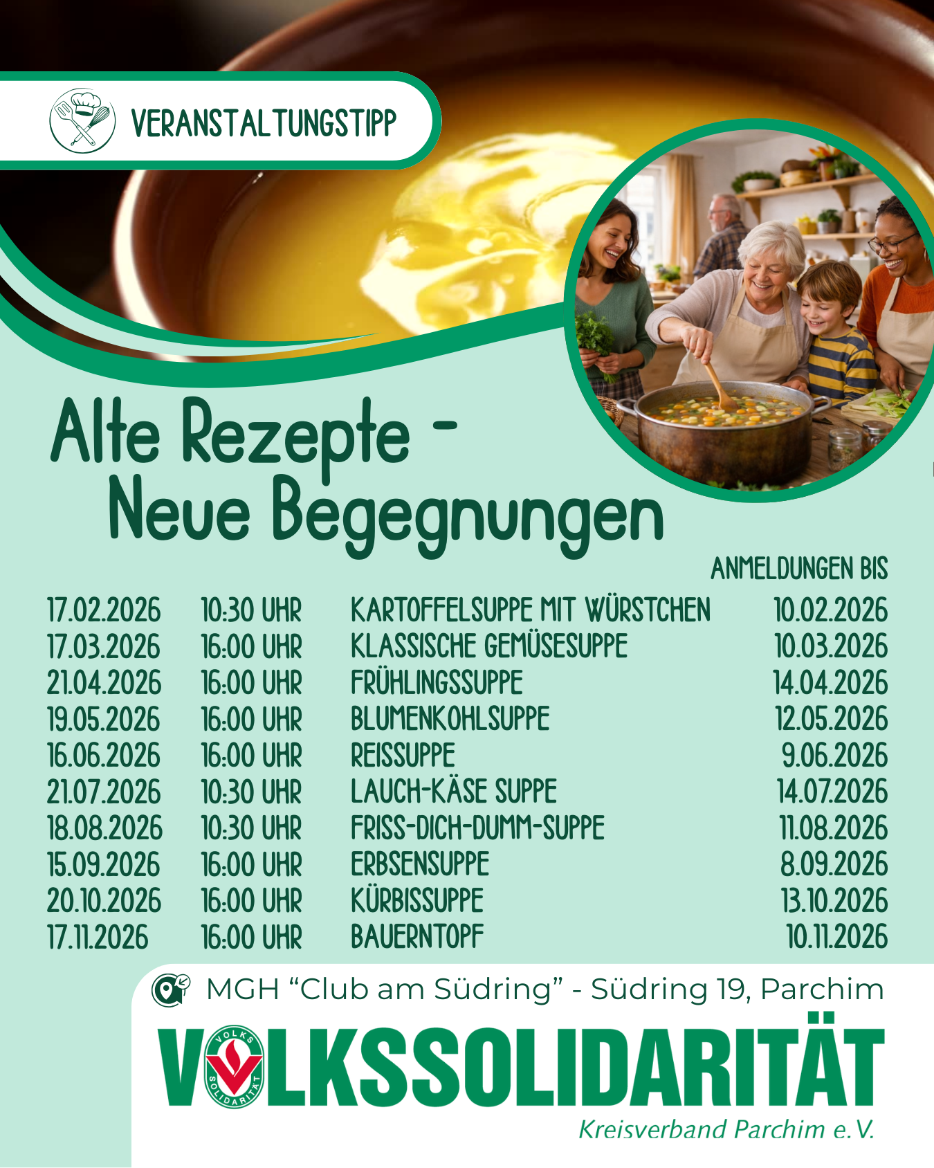 Ob Kartoffelsuppe, Linseneintopf oder eine fast vergessene Spezialität: Jede Woche steht ein anderes Rezept im Mittelpunkt. Beim Schnippeln, Rühren und Probieren kommen wir ins Gespräch, lernen neue Menschen kennen und schaffen einen gemütlichen Treffpunkt für Jung und Alt.